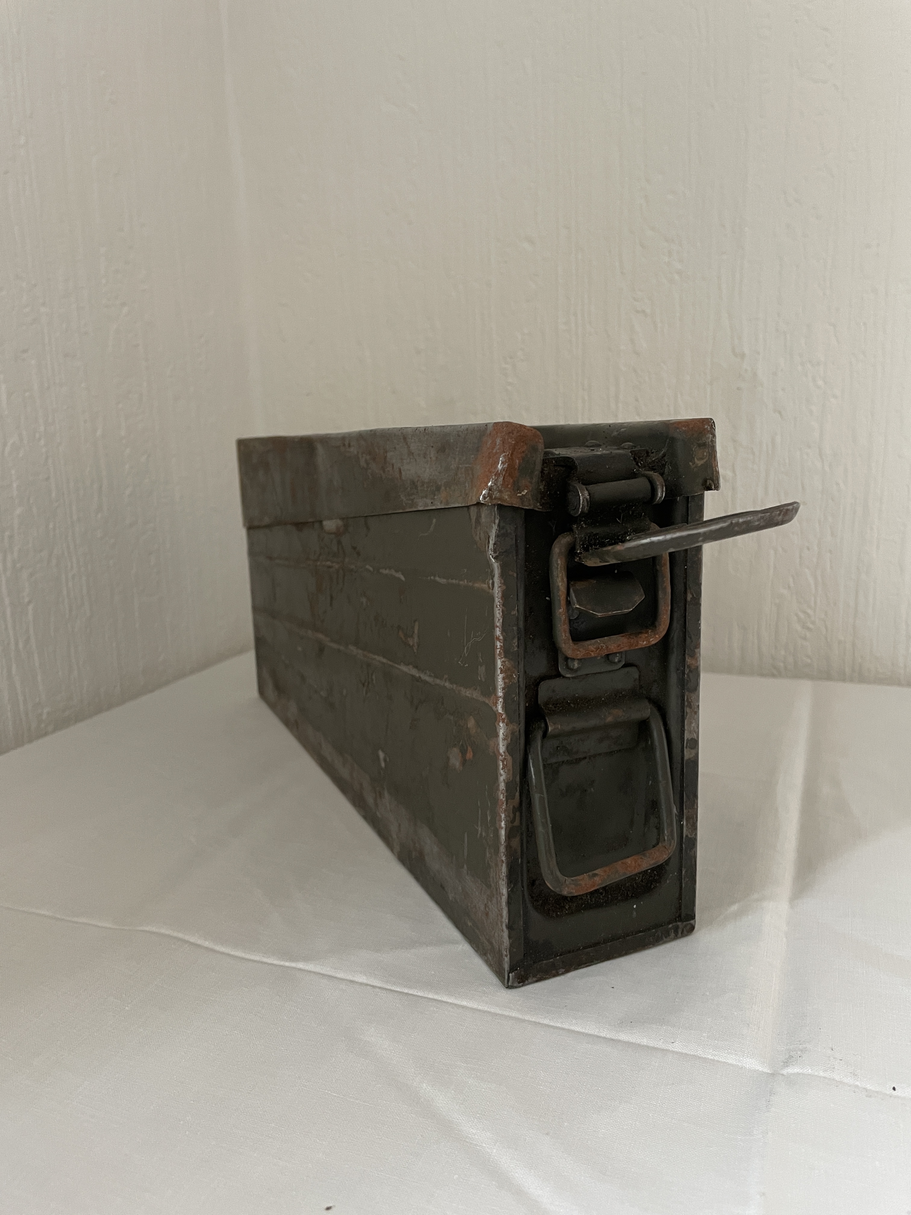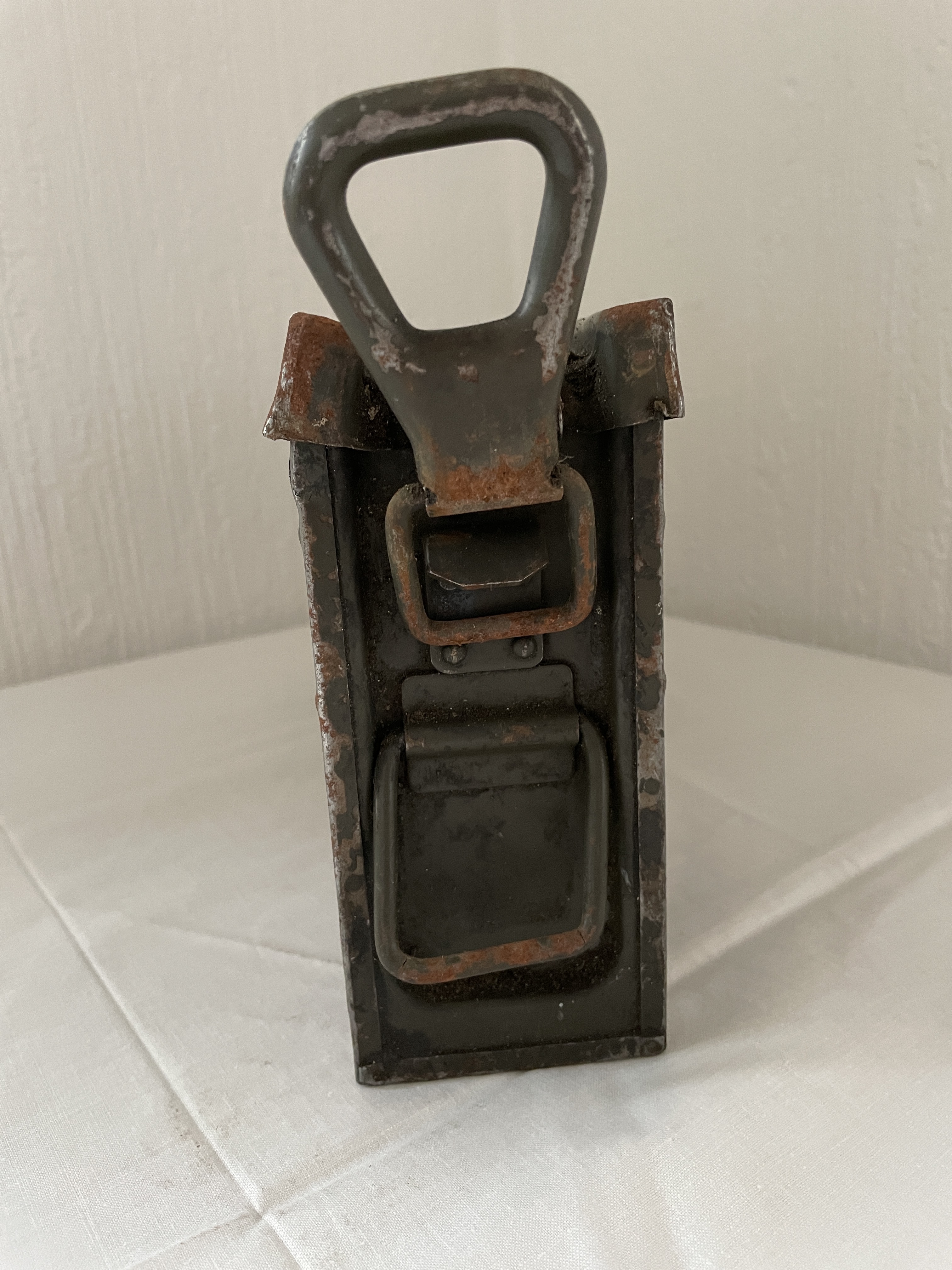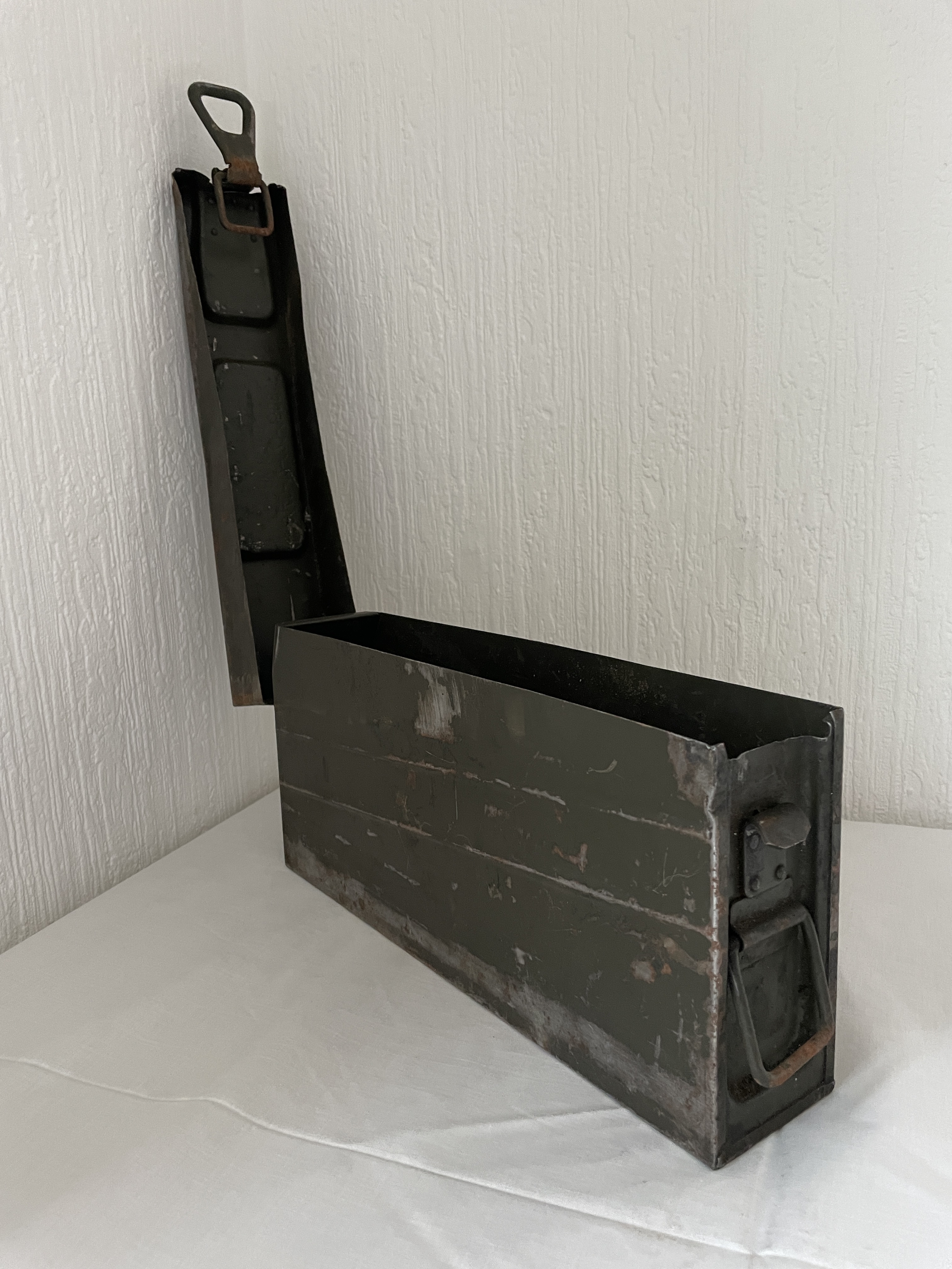 Die Kiste ist von der nur von der gleichen Seite per Klappezu öffnen. Die Kisten sind stark gebraucht und weisen Lackschäden/ Rostschäden auf (Siehe Fotos).