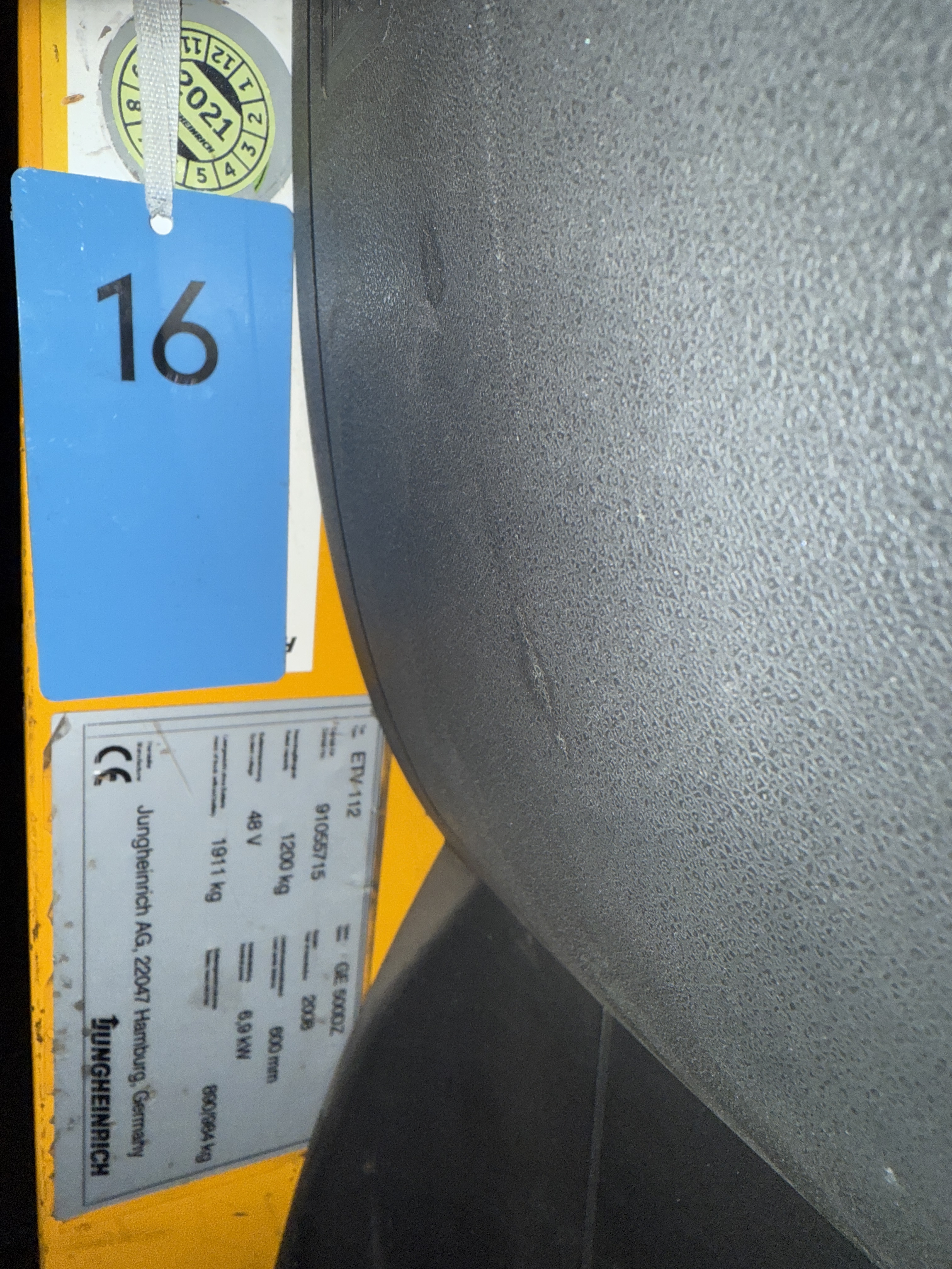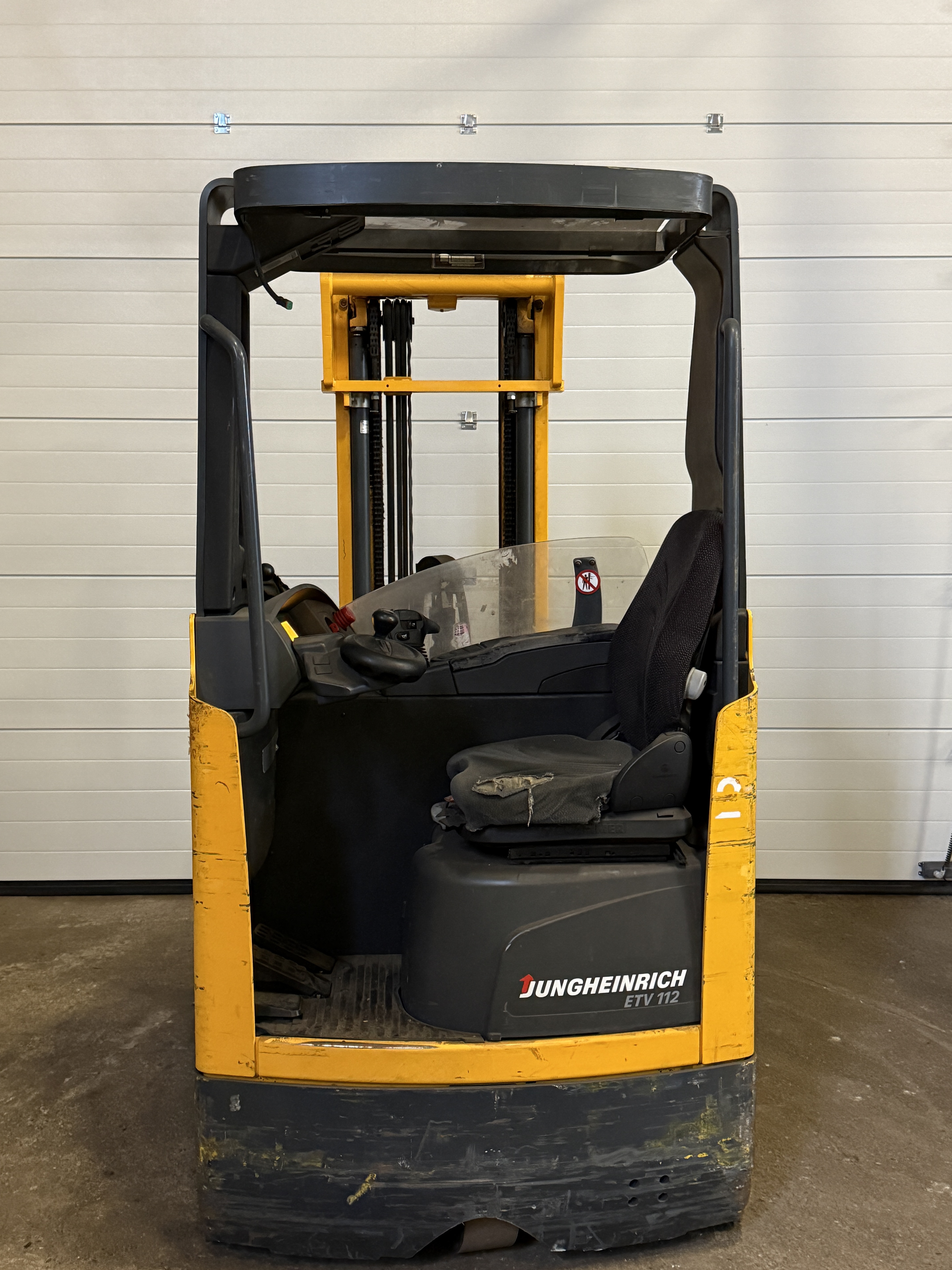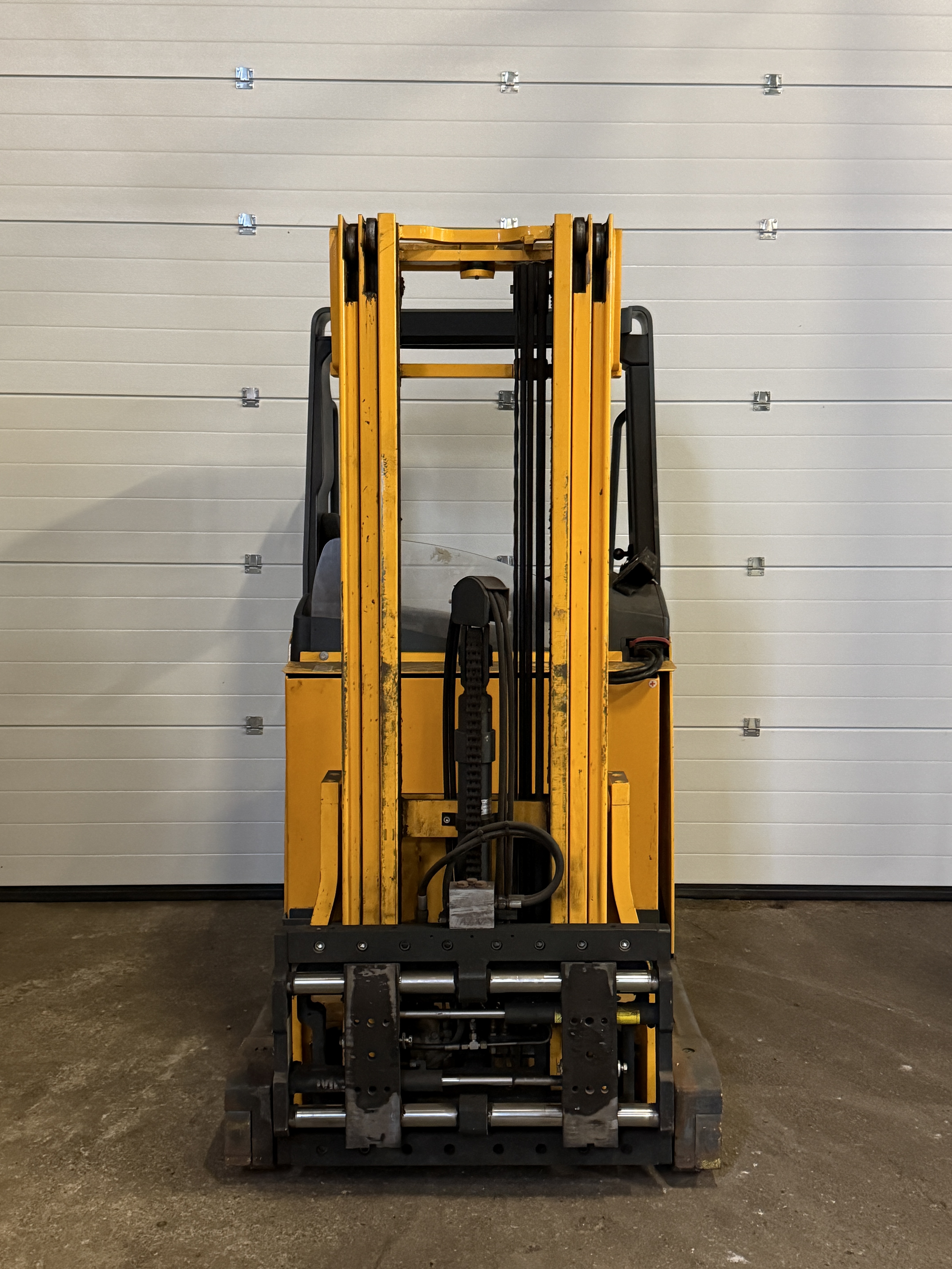 Schubmaststapler, Elektroantrieb, 1,2to Tragkraft, Ident-Nr.: 91055715, Baujahr 2008, 11910 Arbeitsstunden, 220 cm Bauhöhe, Hubhöhe 500 cm, 150 cm Freihub, Triplexmast, Seitenschub, Zinkenverstellung, 4. Steuerventil, Schutzdach, Gabellänge 120 cm, Batterie aus 10/02, Steuerung über Joystick