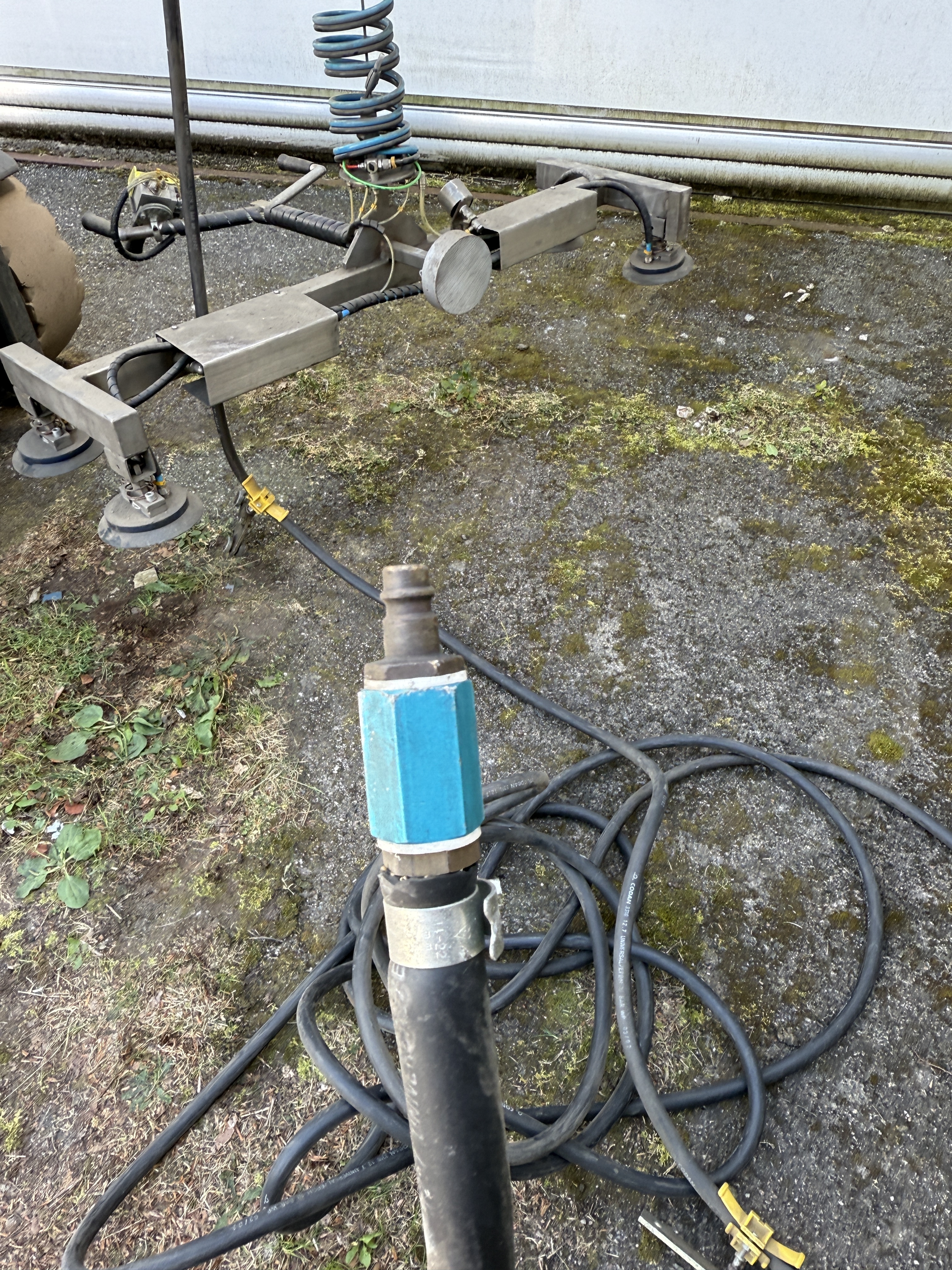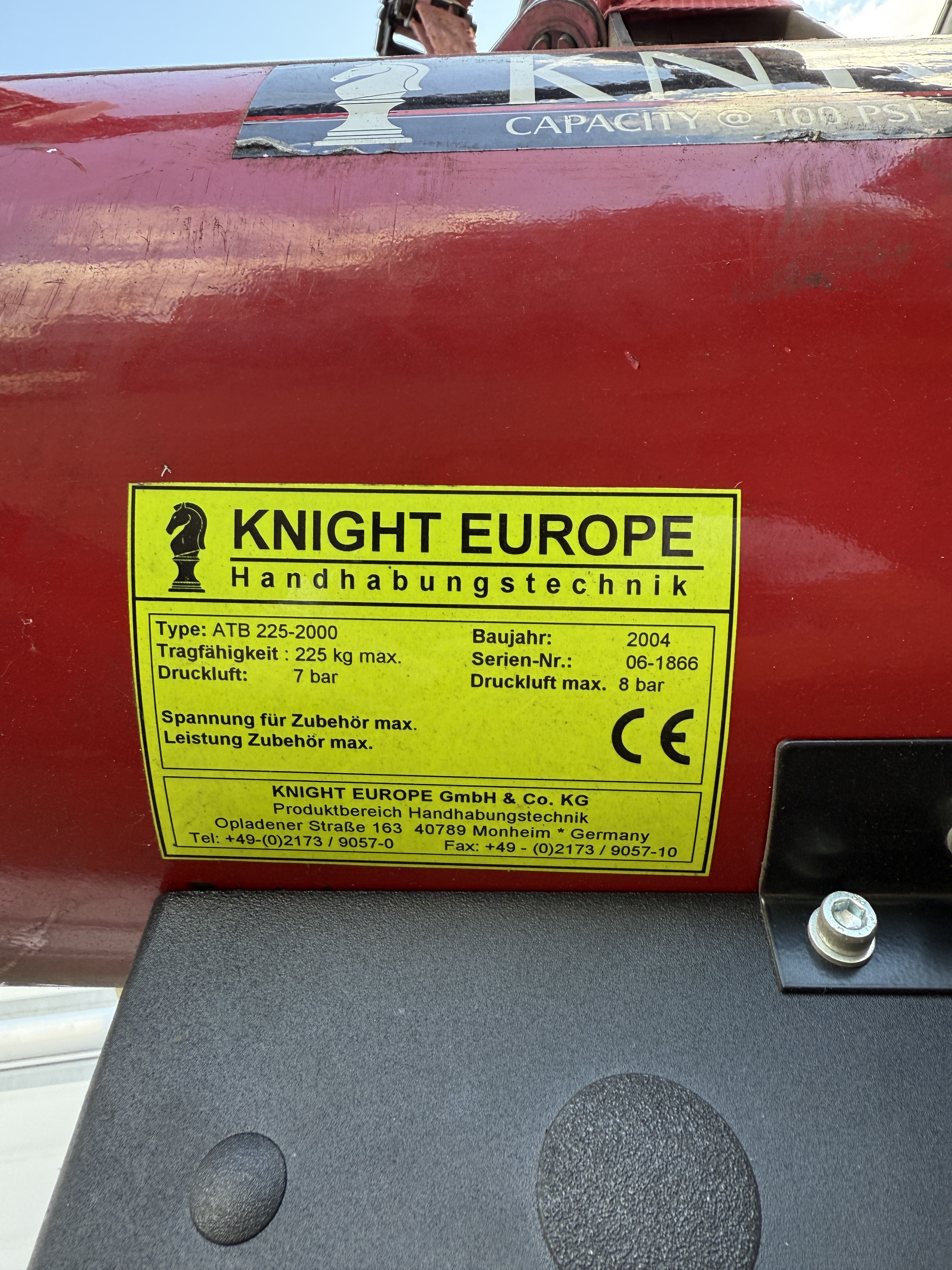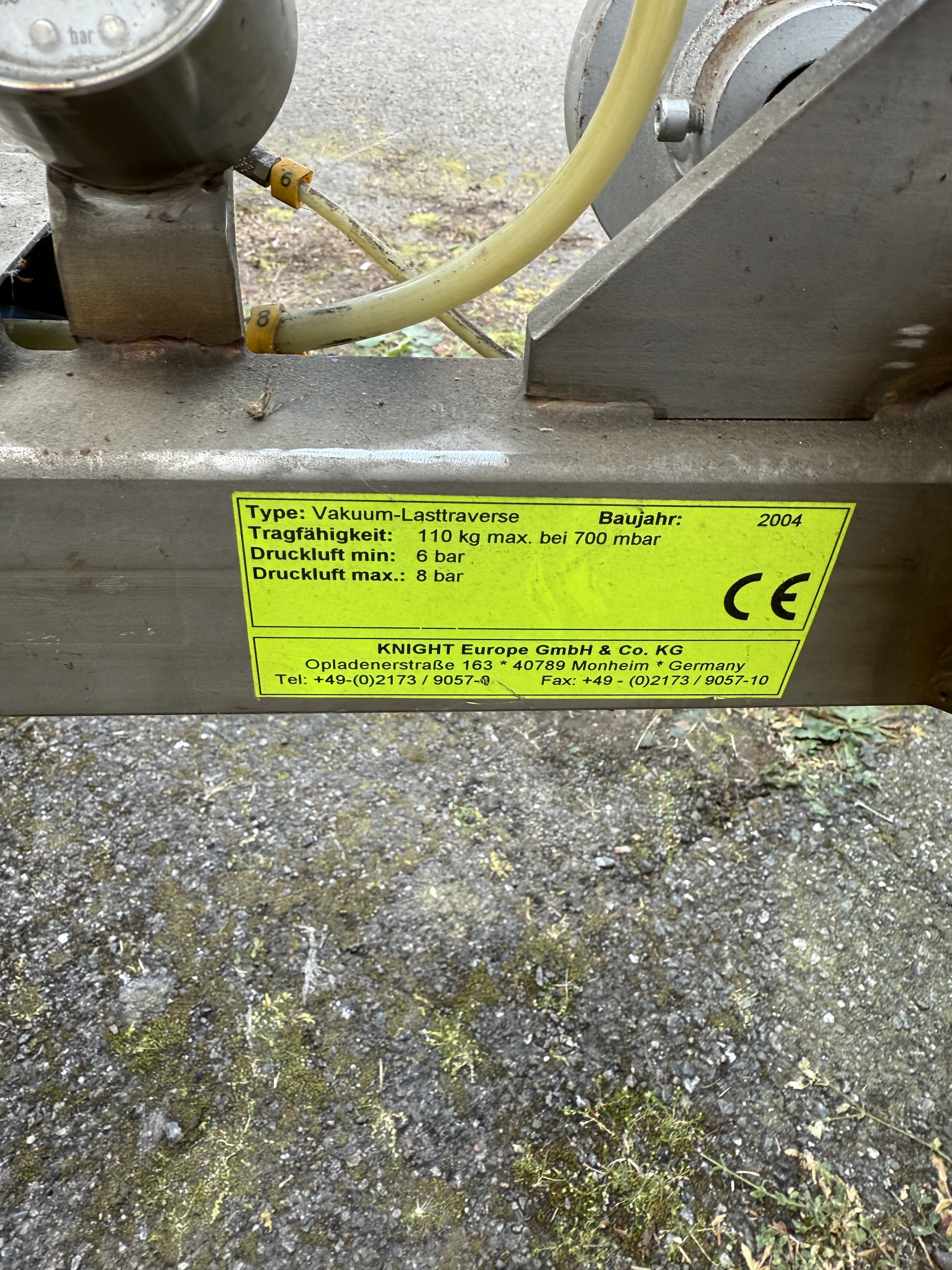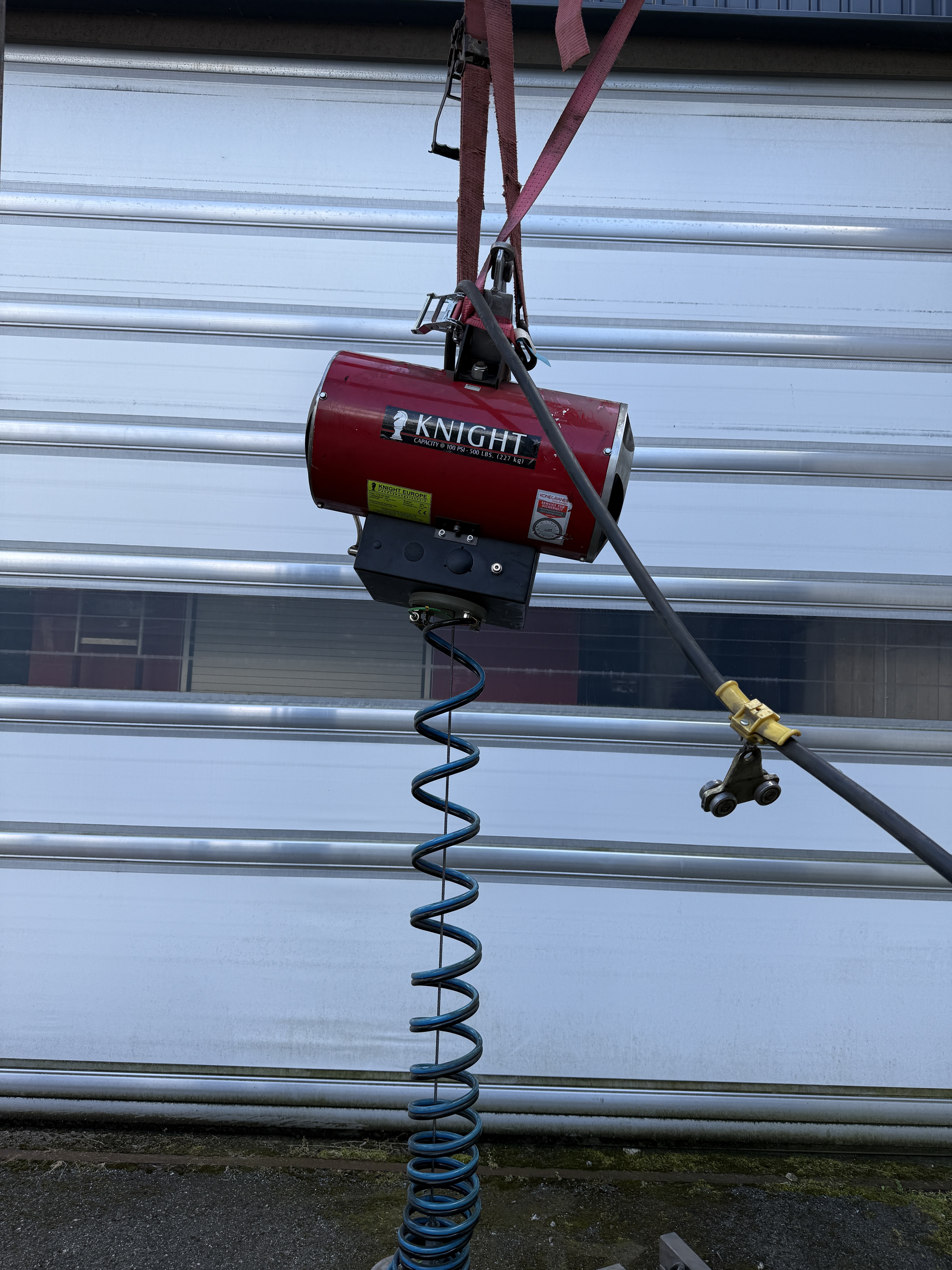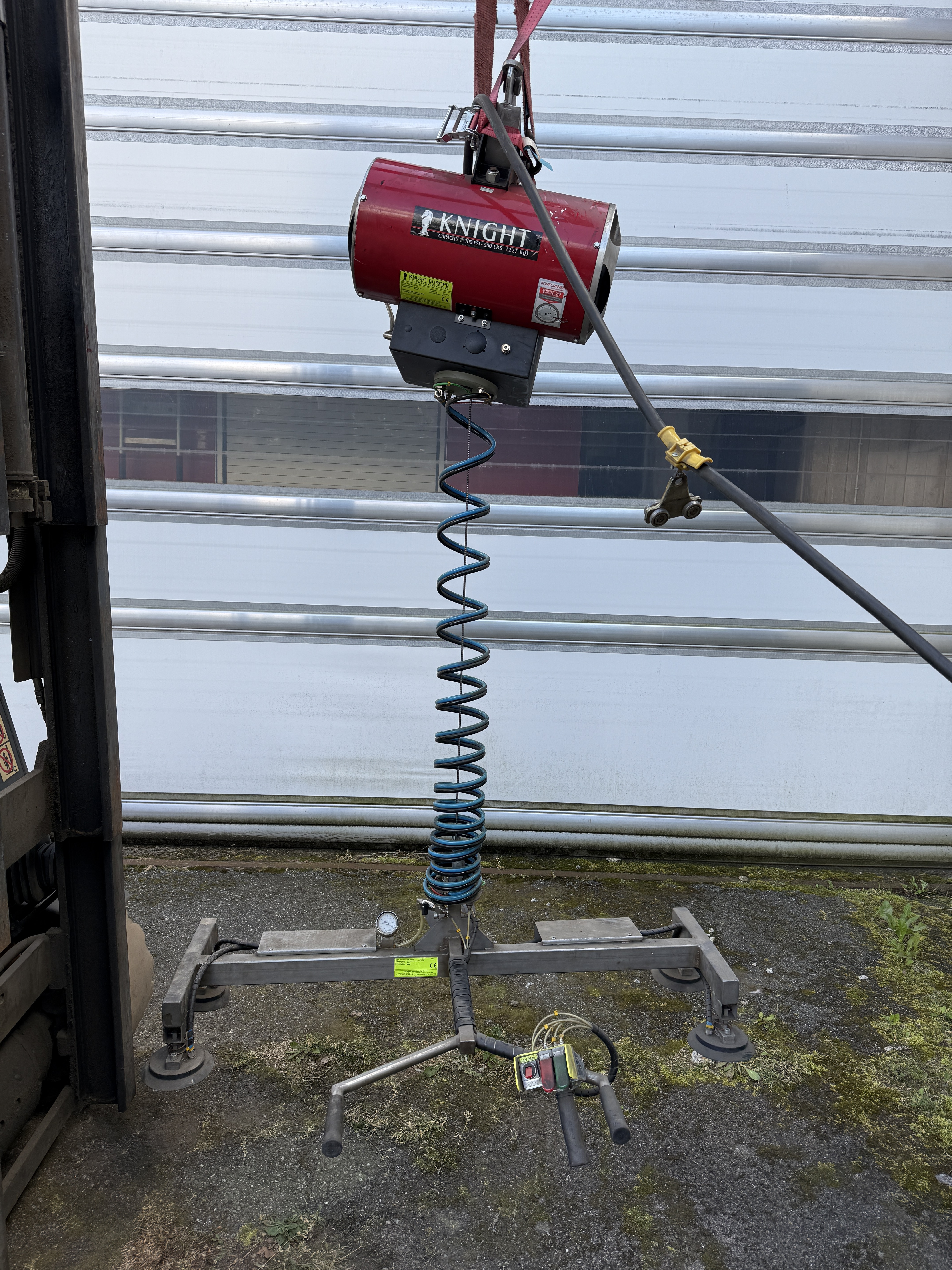 Angeboten wird eine luftdruckbetriebene Seilwinde mit einem Vakuumheber der Firma Knight Europe aus dem Jahr 2004.