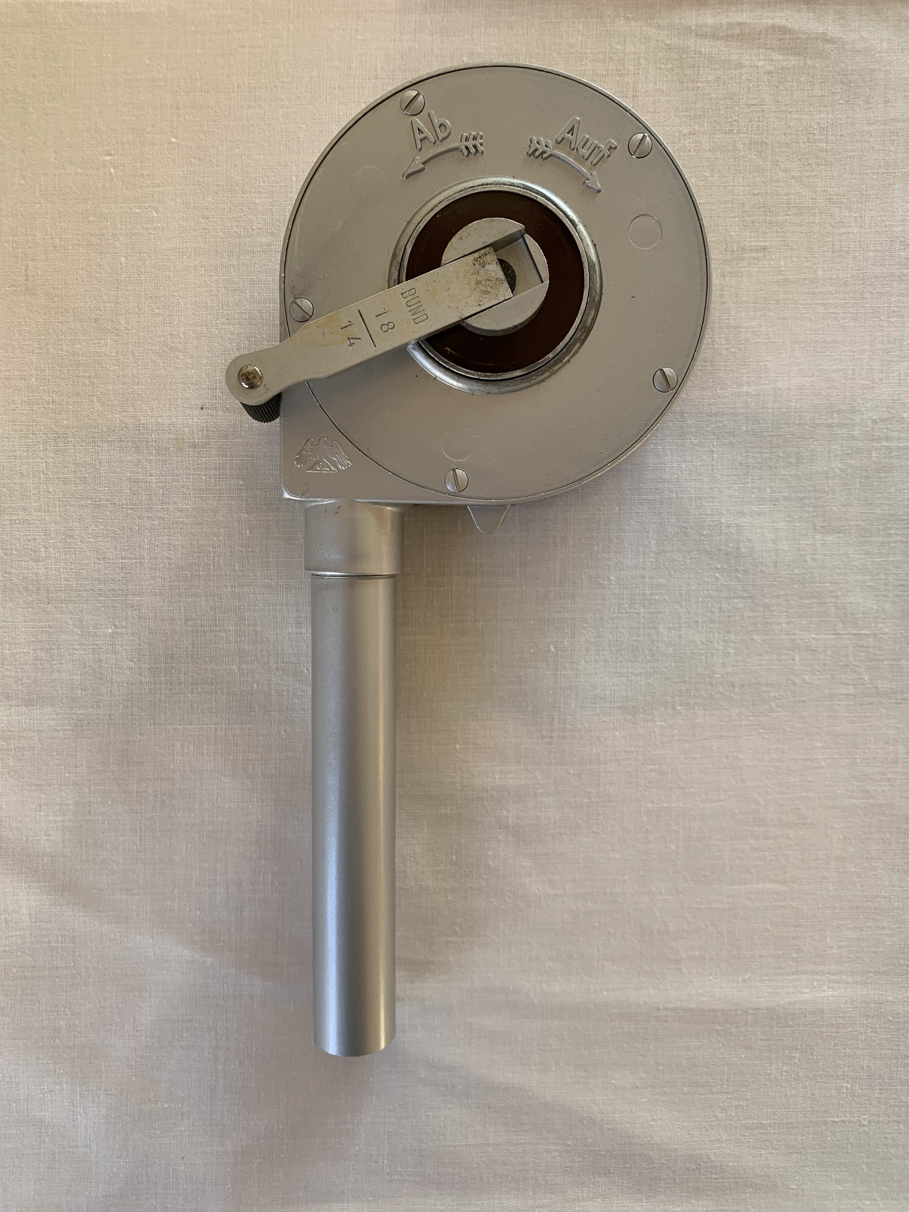 Durch eine Kurbel kann das Band wieder aufgewickelt werden.