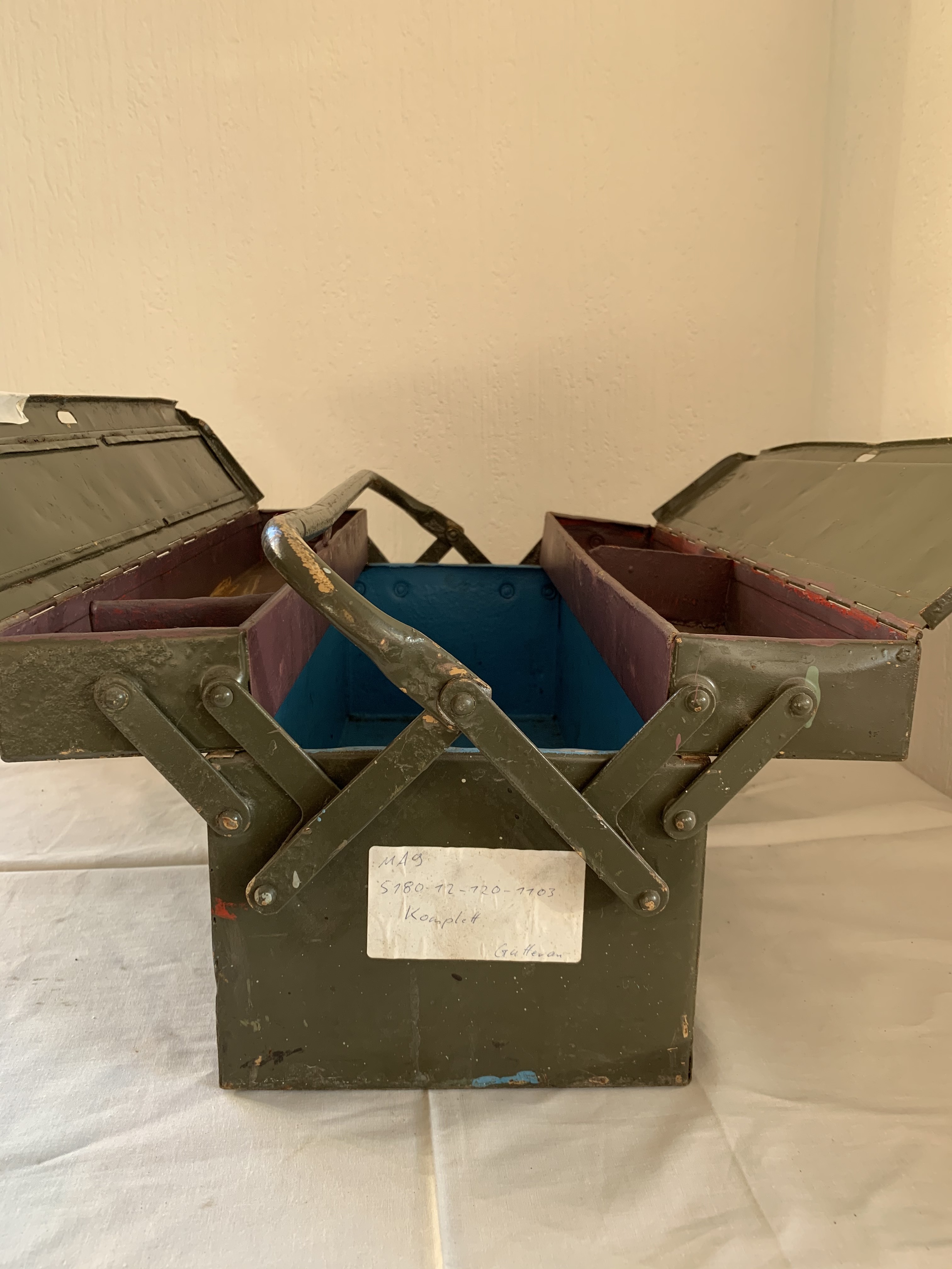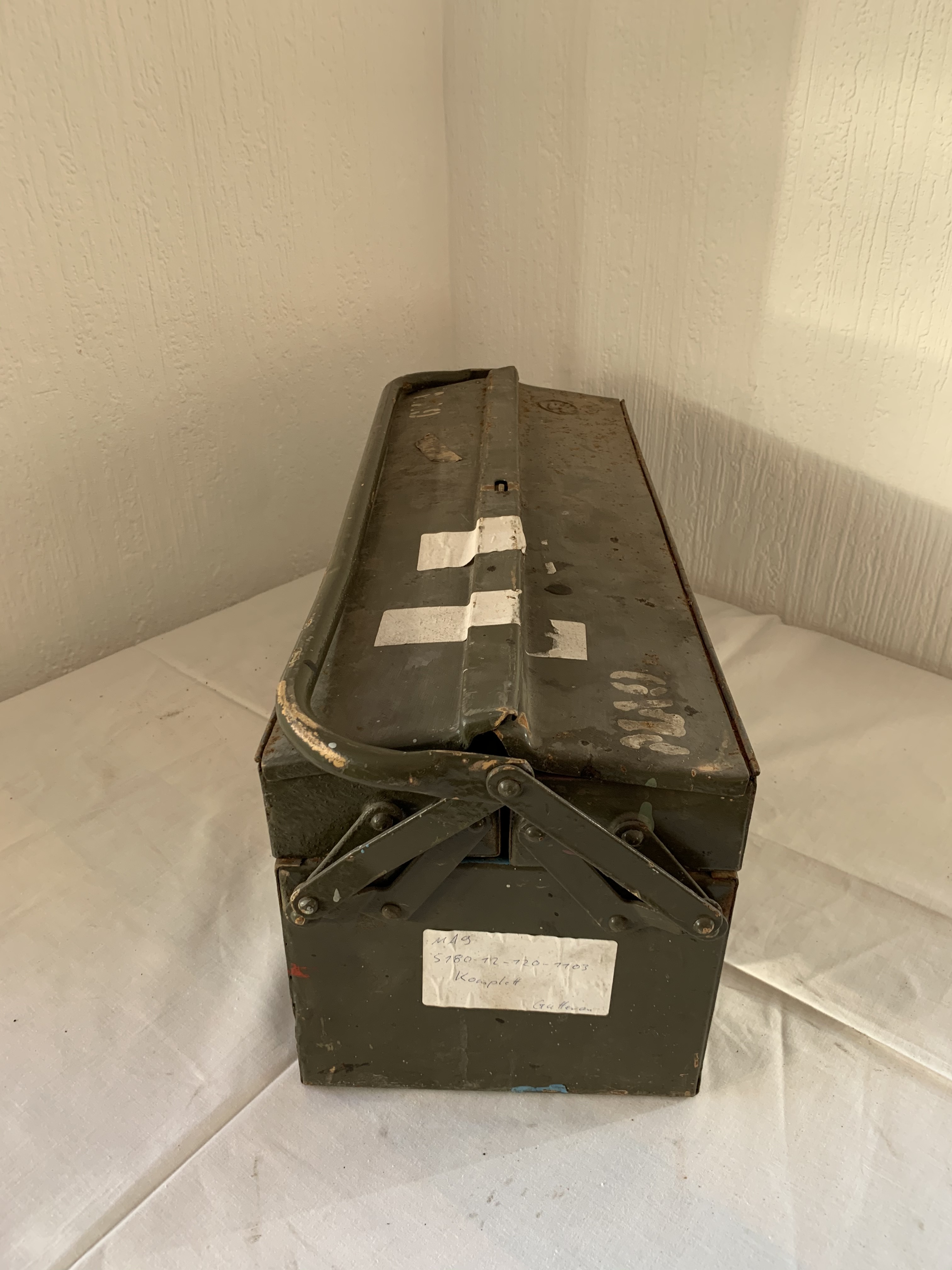 Diese Werkzeugkisten stammen von der Bundeswehr und sind dementsprechende auch gebraucht. Lackschäden und auch mal Beulen können vorhanden sein.